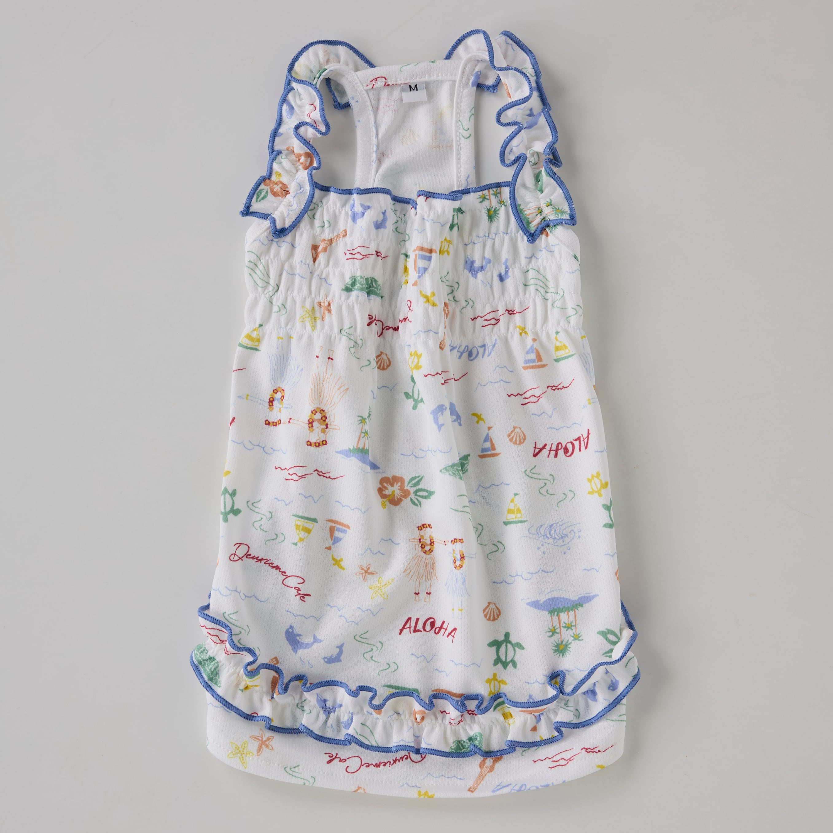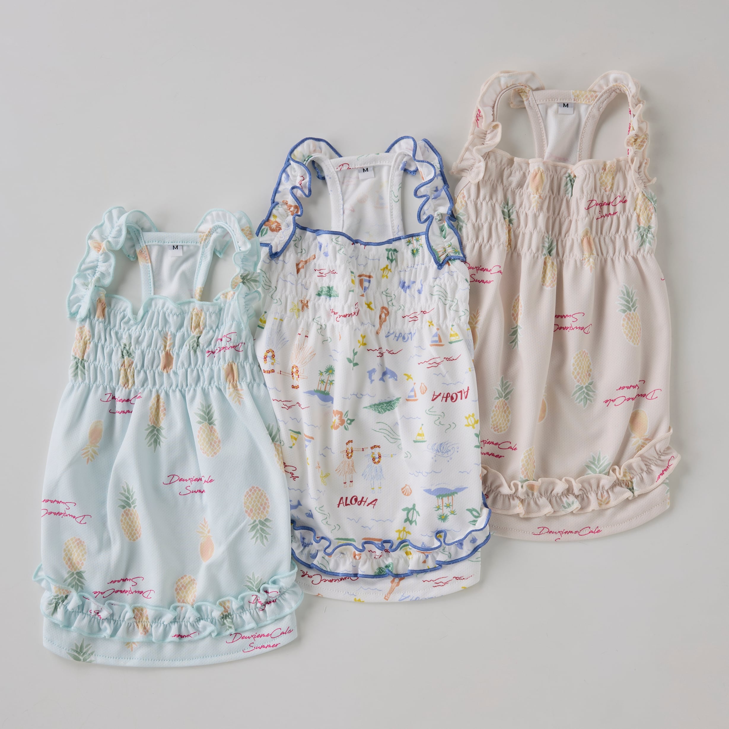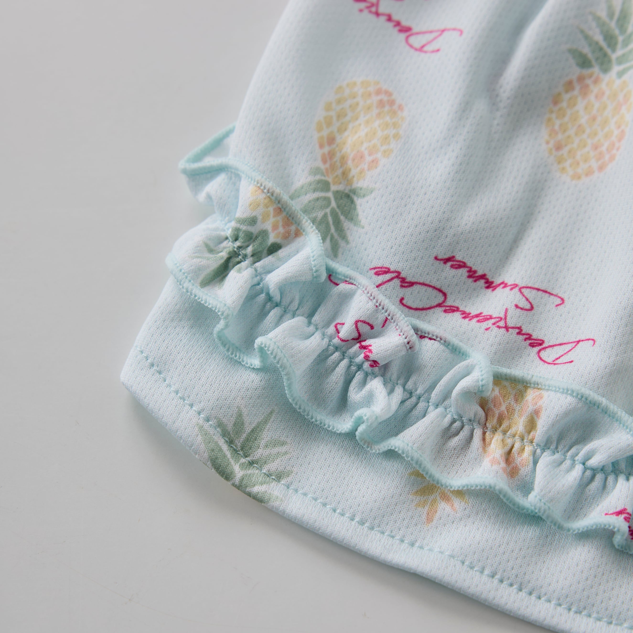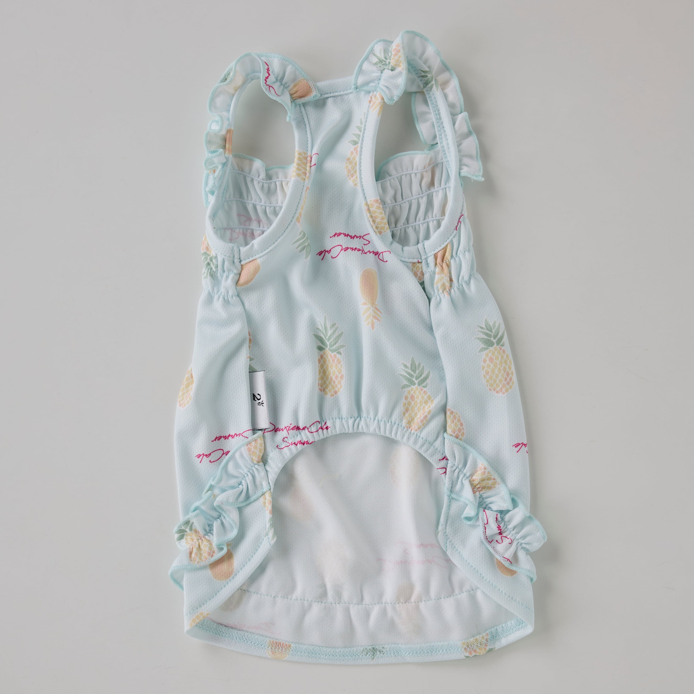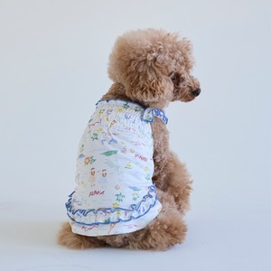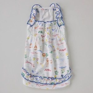 肩紐と裾のフリルと胸元のゴムシャーリング部分がかわいらしいデザインです。